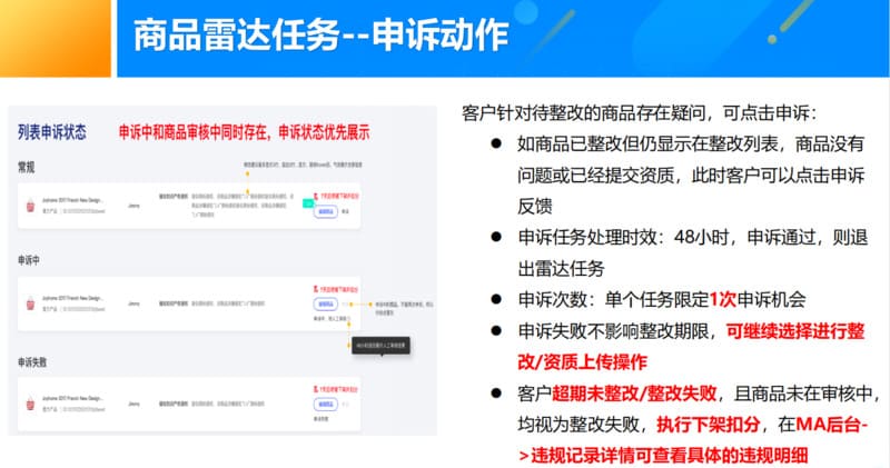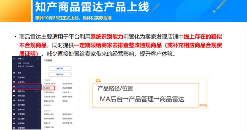 商品雷达主要适用于平台利用系统识别能力前置化为卖家发现店铺中线上存在的疑似不合规商品,同时提供一定期限给商家去排查整改违规商品(或补充相应商品合规资 质证明),减少直接处置给卖家带来的经营影响,提升客户体验。