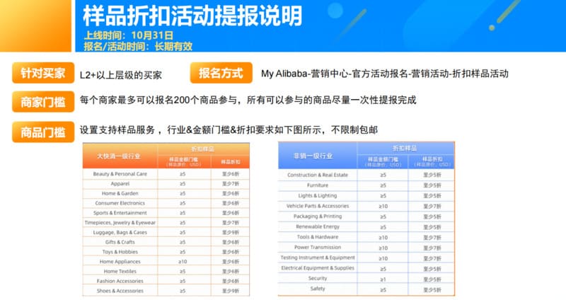 针对严肃买家,提供折扣样品,提升时新效率。每个商家最多可以报名200个商品参与,所有可以参与的商品尽量一次性提报完成。